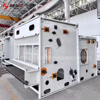 This feeder is used for medium to coarse denier fibers to store the opened fiber and then facilitate the transfer of an even layer or even quantity of fiber across the width of the machine to feed the card